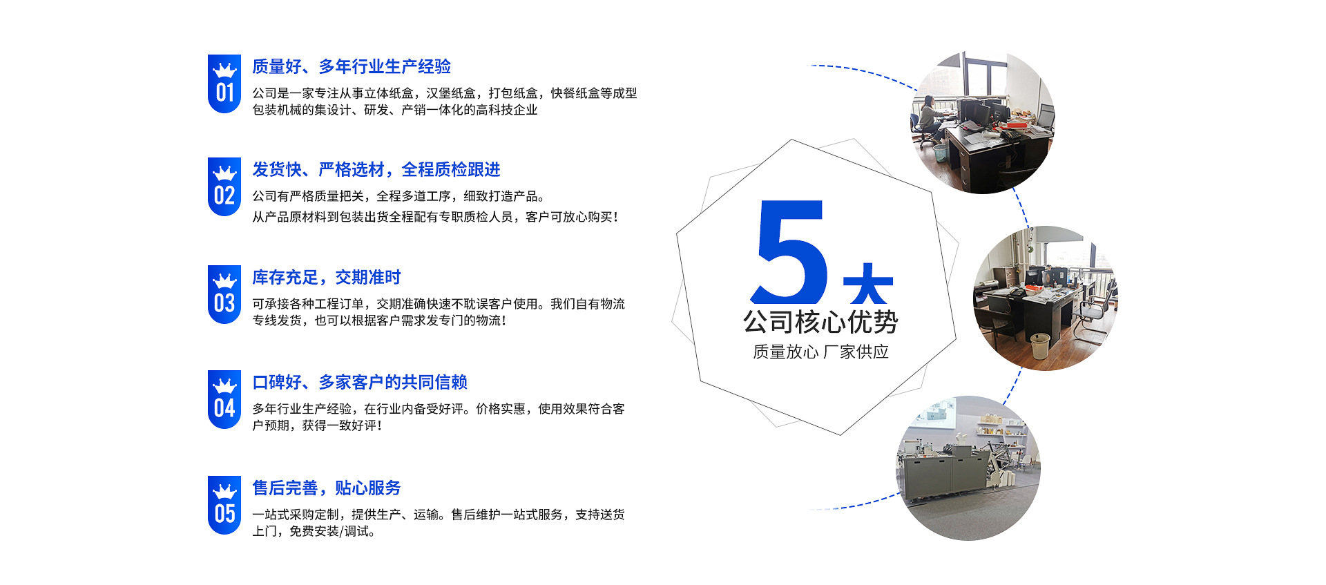 瑞安市中法機械有限公司是一家從事立體紙盒機,漢堡紙盒機,打包紙盒機,快餐紙盒機等成型包裝機械的設(shè)計、研發(fā)、產(chǎn)銷一體化的高科技企業(yè)。公司有現(xiàn)代化的管理體系和完善的售后服務(wù)體系;有一支具有充滿青春活力的精銳研發(fā)團隊!自成立以來,中法公司堅守“誠信、學(xué)習(xí)、發(fā)展”的企業(yè)發(fā)展理念,堅持“以誠信為道、以質(zhì)優(yōu)取勝”的經(jīng)營原則,在市場競爭中取得了良好的社會和經(jīng)濟效益!